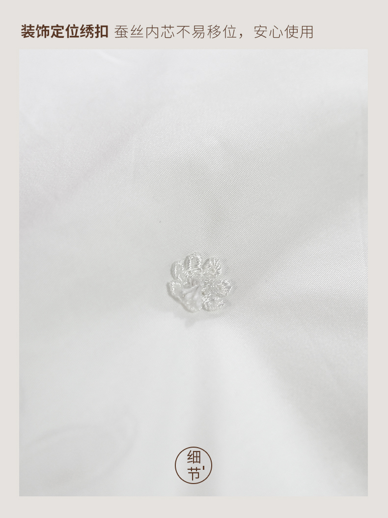 成份工艺:60支贡缎 100%桑蚕丝长丝 手工钉花