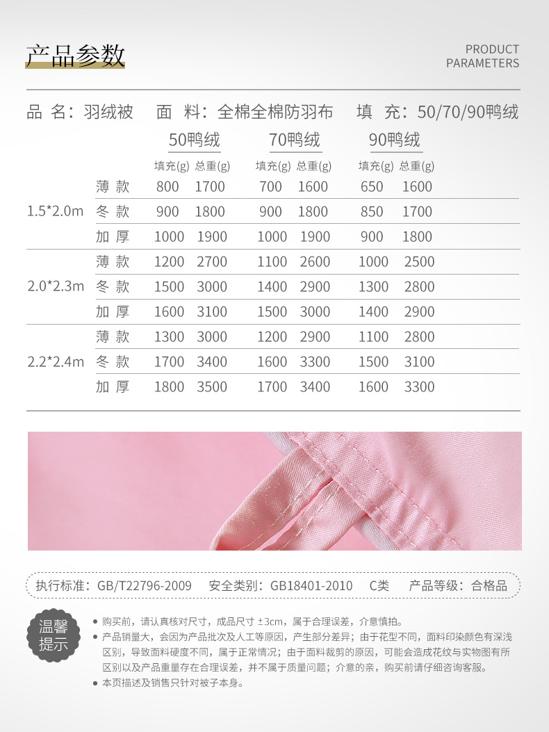 产品分类:50%白鸭绒 全棉单边款羽绒被