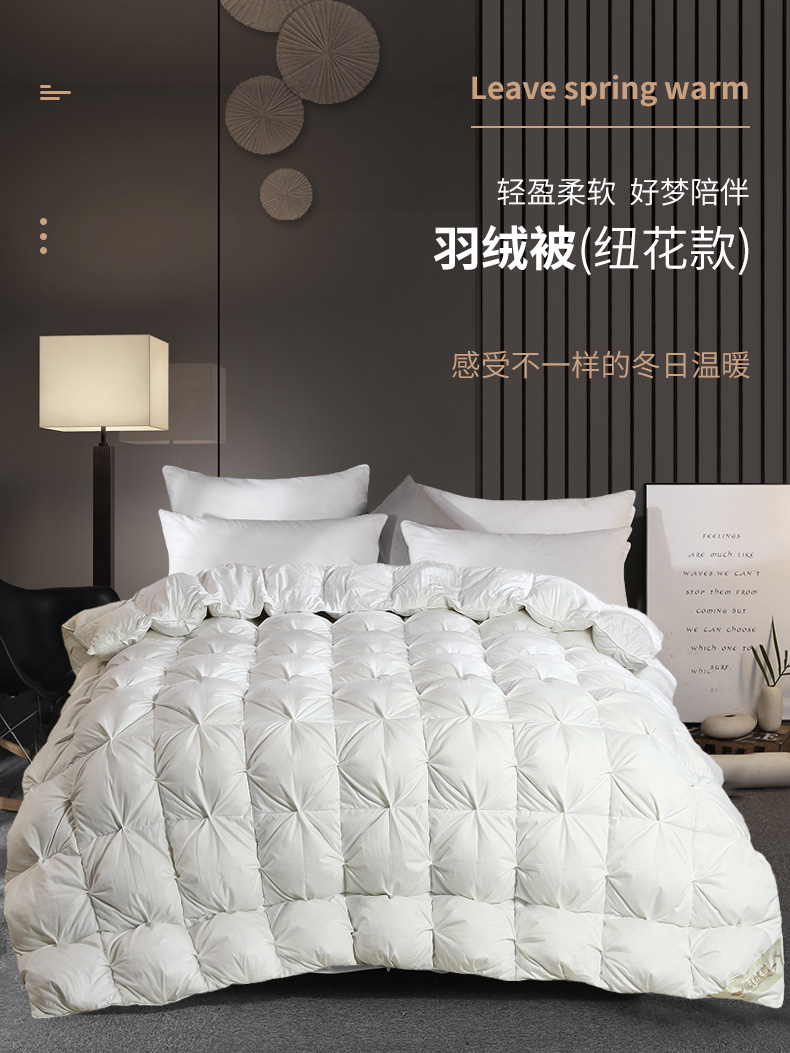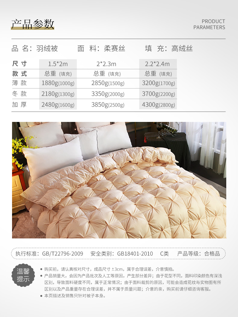 产品分类:100%高绒丝 80柔赛丝钮花款羽绒被