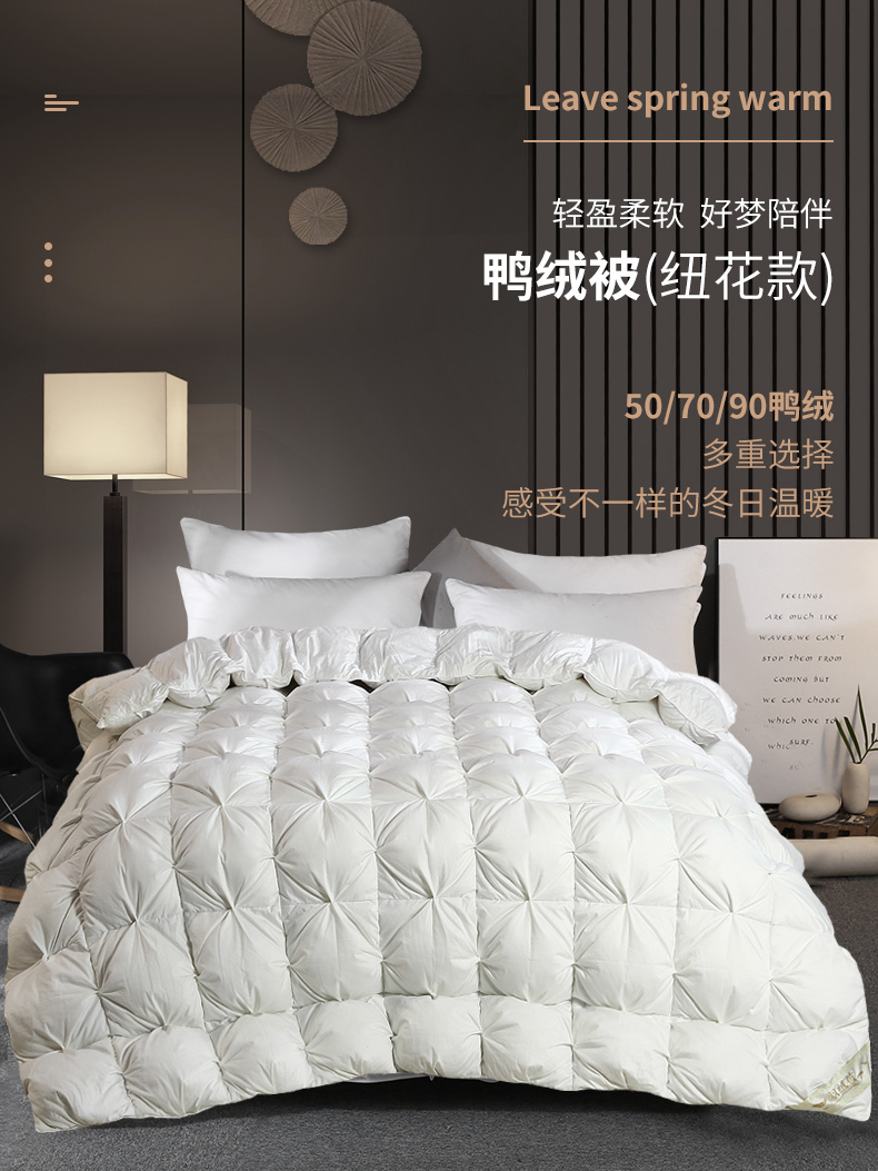 成份工艺:钮花款 90%白鸭绒 80柔赛丝