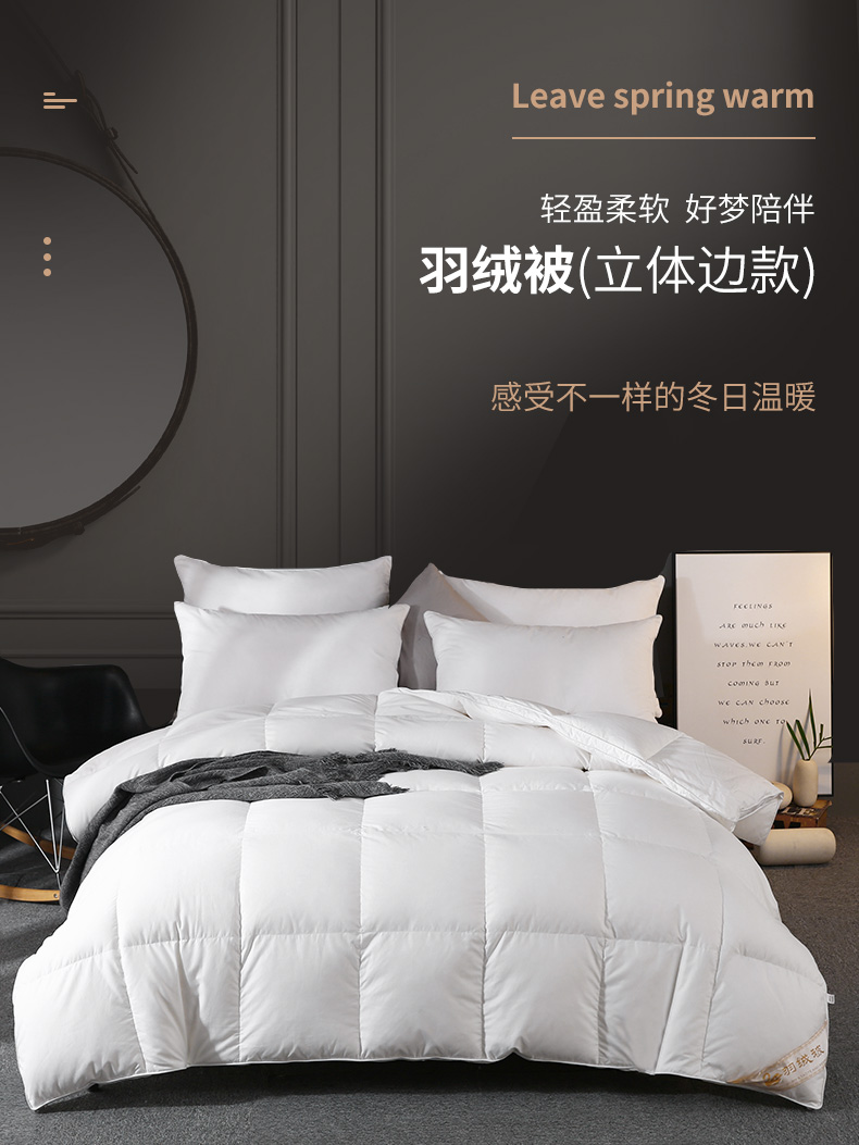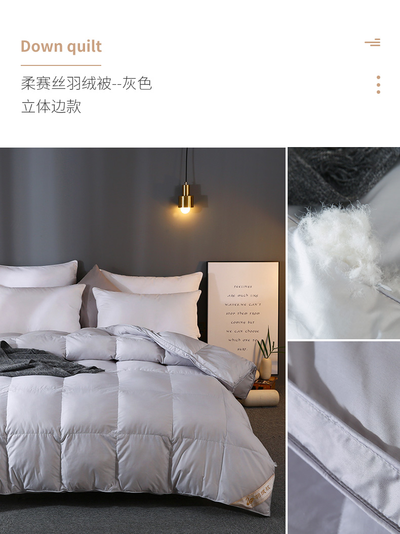 产品分类:100%高绒丝80柔赛丝立体边羽绒被