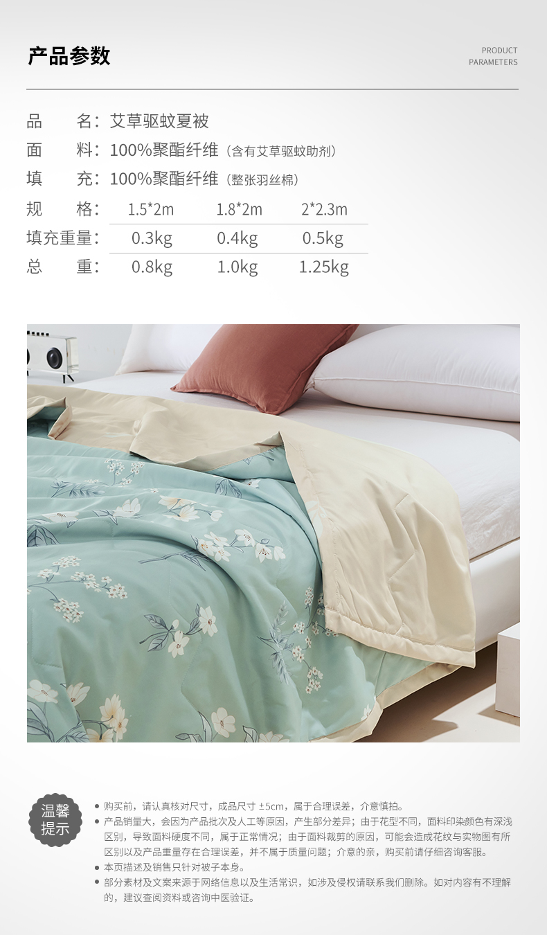 成份工艺:艾草 驱蚊 助剂 宽包边 整张棉填充