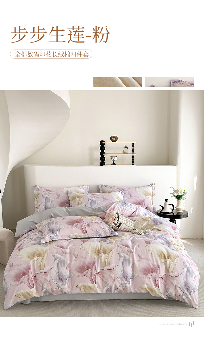 2024长绒棉数码印花四件套-步步生莲-粉